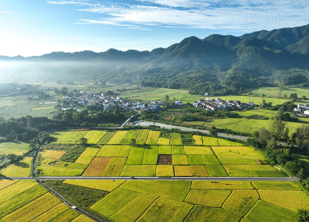 Check out the enchanting countryside scenery in Nanping ancient village, Anhui province. As the morning sun rises, the village is cloaked in mist, with fragrant rice fields and a breathtaking fusion of traditional Hui-style architecture and the vibrant colors of autumn.