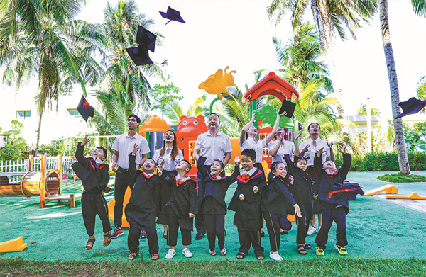 Students at the Sansha Yongxing School in Hainan province celebrate graduation day in the company of their teachers. [Photo provided to China Daily]