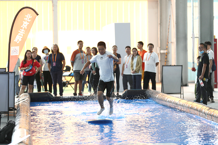 A staffer demonstrates skimboarding at the sports services section of Shougang Park on Saturday. ZOU HONG/CHINA DAILY