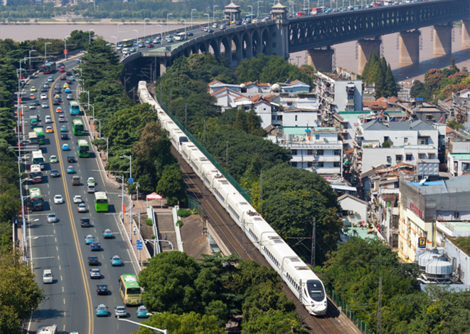 A bullet train is running on Wuhan Yangtze River Bridge.