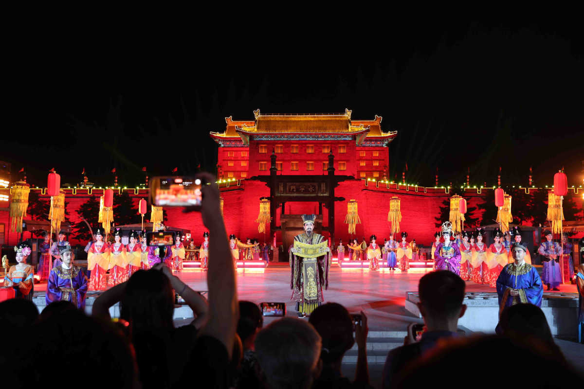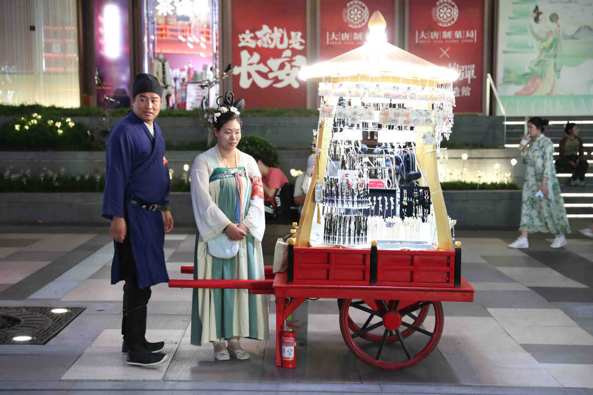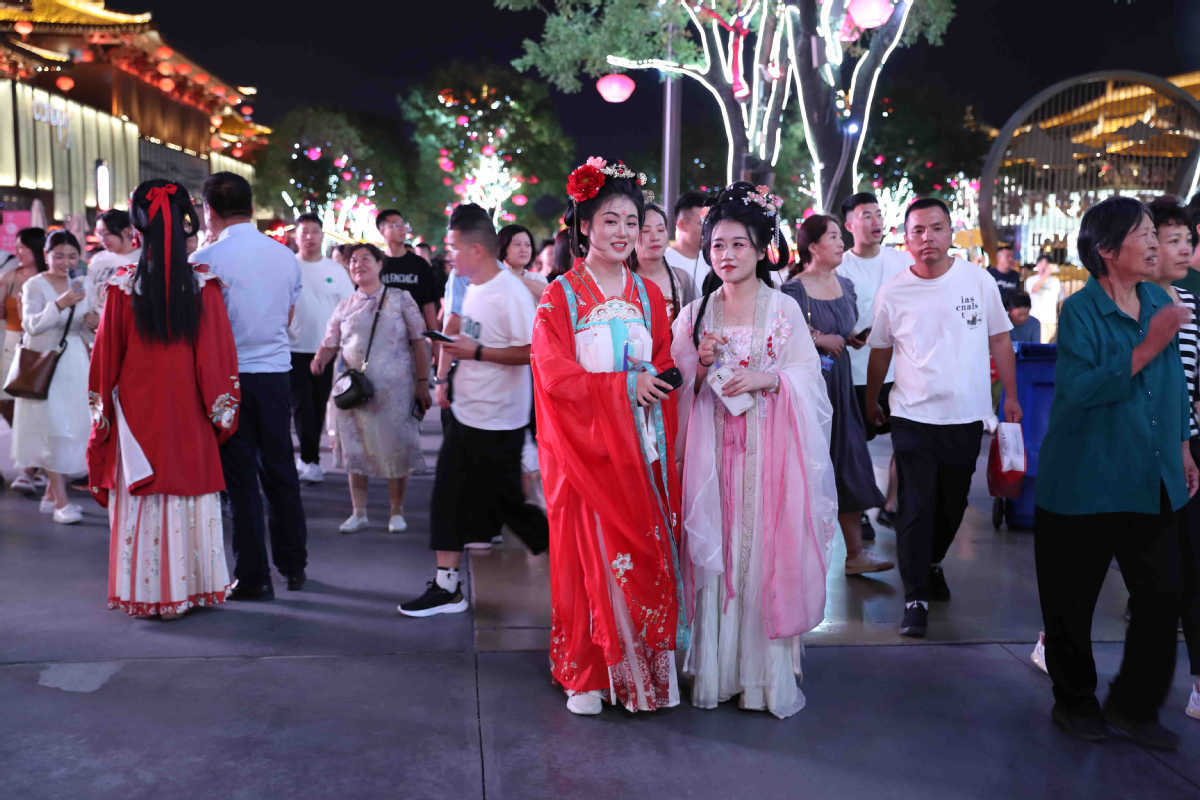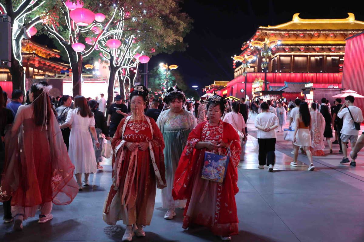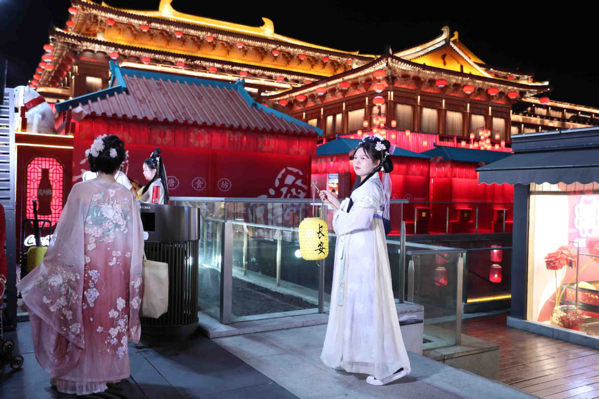 Sitting across from the Great Wild Goose Pagoda in the Grand Mercy and Favor Temple, built more than 1,350 years ago, is the Grand Tang Dynasty Ever Bright City. Planned in the 1990s and rebuilt in 2018, it has become one of the top tourist destinations in Xi'an, attracting visitors from around the country. Women of all ages dress in Tang Dynasty (618-907) attire and makeup as they stroll through the 2.1-kilometer street, where Tang-style architecture featuring flying eaves and layered pavilions abound and the glorious culture of Tang is presented in modern style.