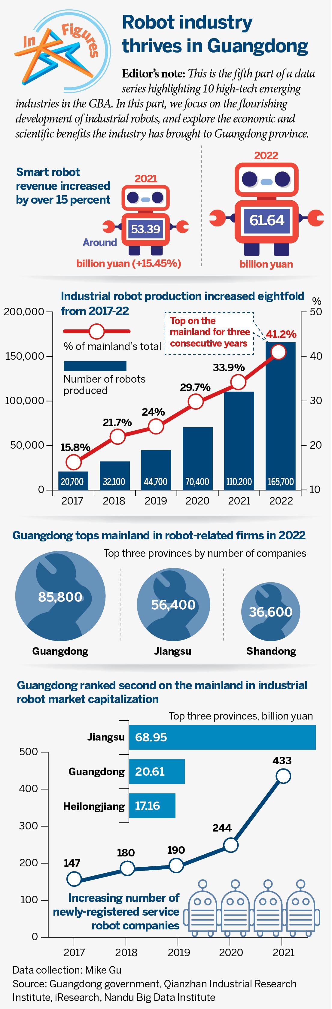 Editor’s note: This is the fifth part of a data series highlighting 10 high-tech emerging industries in the GBA. In this part, we focus on the flourishing development of industrial robots, and explore the economic and scientific benefits the industry has brought to Guangdong province.