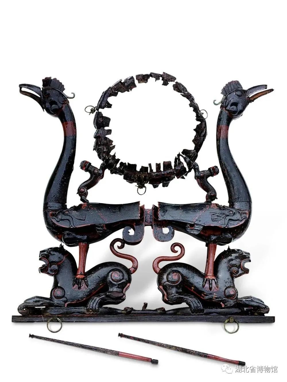 The delicately-designed and black-lacquered drum showcases the combination of the majestic tiger base and the phoenix-shaped support. [Photo/Official WeChat account of the Hubei Provincial Museum]