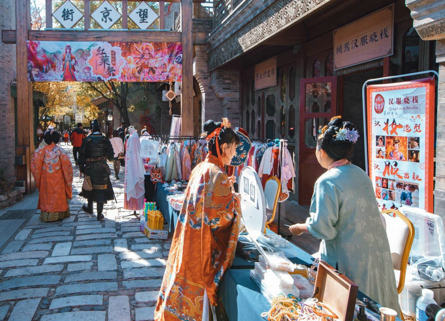 Visitors in traditional Chinese costumes tour the water town. [Photo provided to China Daily]