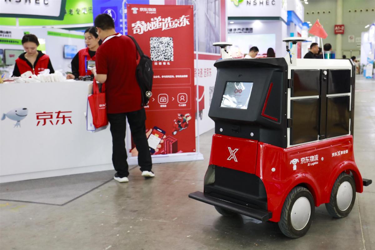 A self-driving JD delivery vehicle is seen at the JD booth during an industry expo in Wuhan, Central China's Hubei province. [Zhang Haiyan/For China Daily]