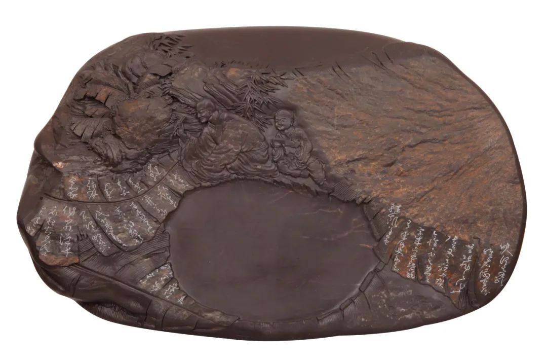An inkstone decorated with patterns of calligrapher Huaisu writing on leaves [Photo/Official WeChat account of the Guangdong Folk Arts Museum]