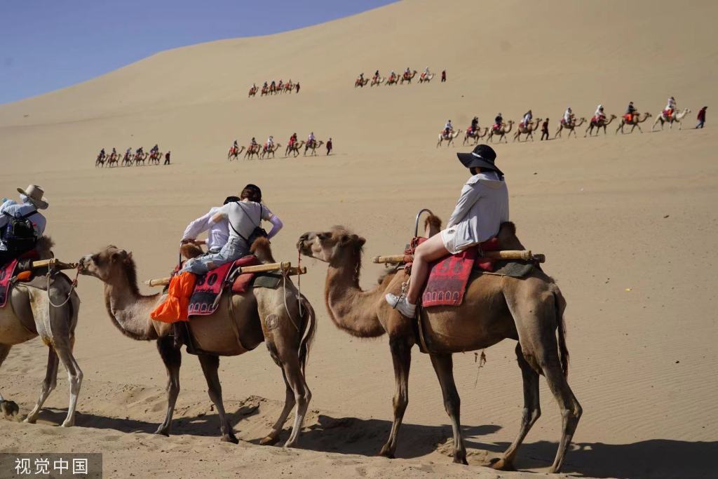 Tourists ride camels at Mingsha Mountain and Yueya Spring in Dunhuang, Gansu province, July 13, 2023. [Photo/VCG]