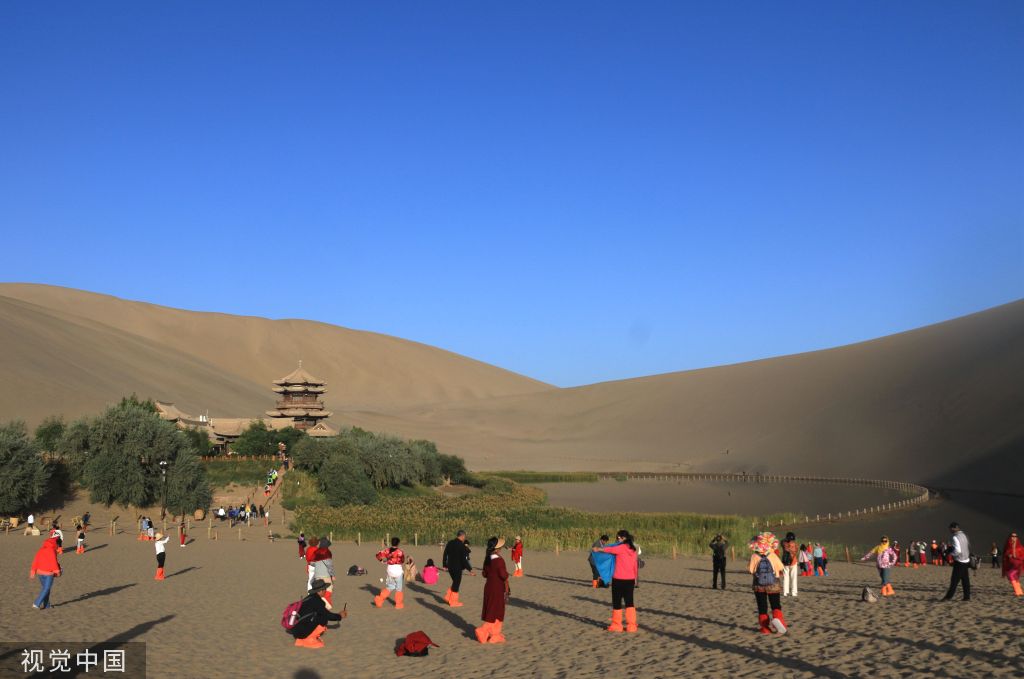 Tourists visit Mingsha Mountain and Yueya Spring in Dunhuang, Gansu province, Sept 10, 2023. [Photo/VCG]