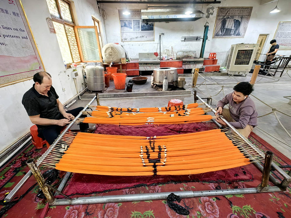 Ojur Amar, a worker at an Adalis manufacturing company in Jiia township, the birthplace of the silk, occasionally stirs silkworm cocoons with a wooden stick, twisting the raw silk fibers into a strand, and then slowly drawing the thread with a spinning wheel. This is the first step of production.