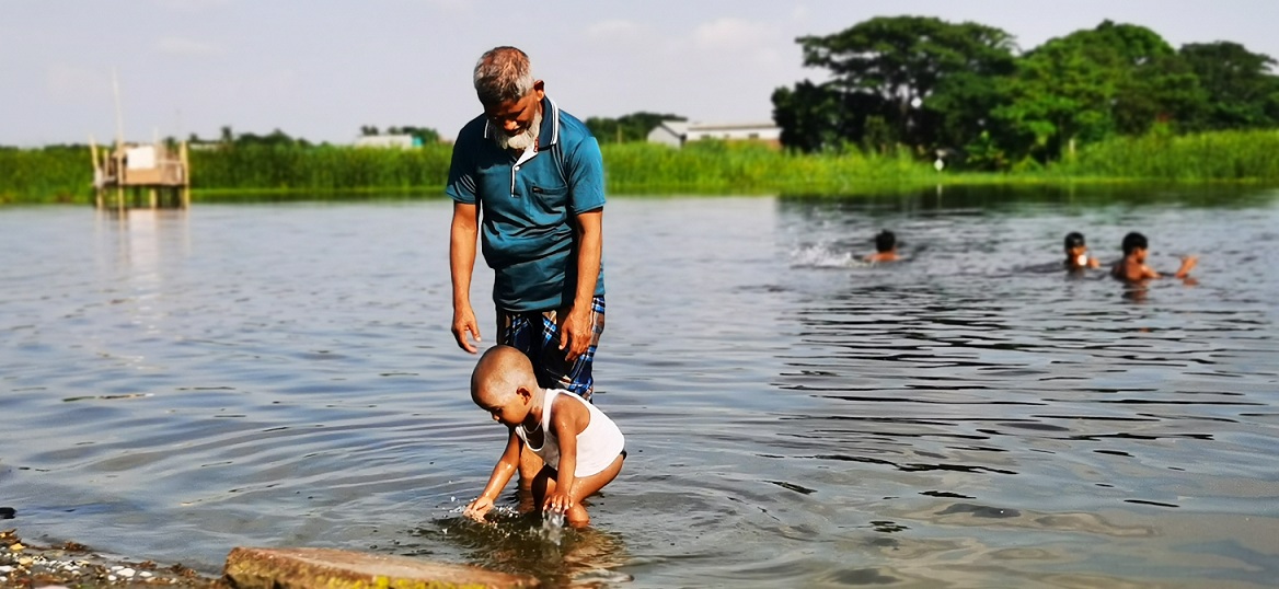 在孟加拉国首都达卡东南郊区的达舍尔甘地村,一片片池塘和河流形成密布的水系,当地孩子们尽情地跳进清澈的河水中嬉戏玩耍。