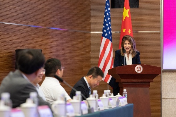New York University President Linda Mills addresses a speech during her visit to the campus of East China Normal University on Saturday. [Photo by Gao Erqiang/chinadaily.com.cn]
