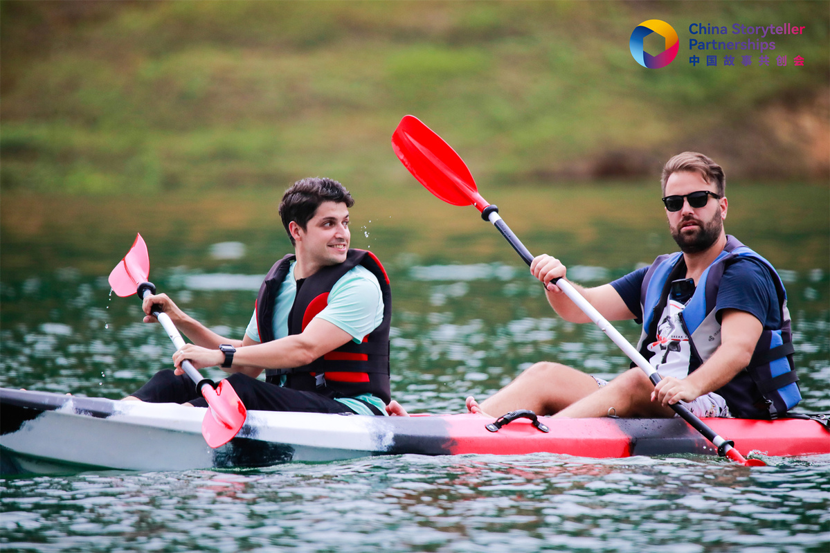 Members of the China Storyteller Partnerships Tour of Amazing Guizhou experience kayaking on Wangfeng Lake in Xingyi city of Qianxi’nan Bouyei and Miao autonomous prefecture, September 14, 2023. [Photo provided to chinadaily.com.cn]