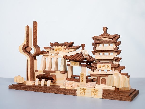 A set of wooden crafts featuring Jinan landmarks is displayed at the fourth CICTF. [Photo provided to english.jinan.gov.cn]