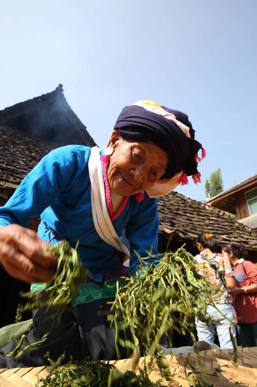 A Blang woman processes tea on Jingmai Mountain. [Photo by Tan Chun/For China Daily]