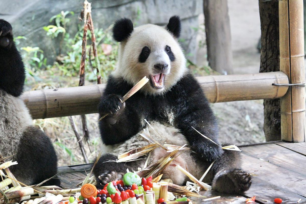 At 8 am on Wednesday, four pandas enjoyed the birthday cake made from bamboo shoots, adorned with strawberries and grapes by the keepers, in their outdoor enclosure.