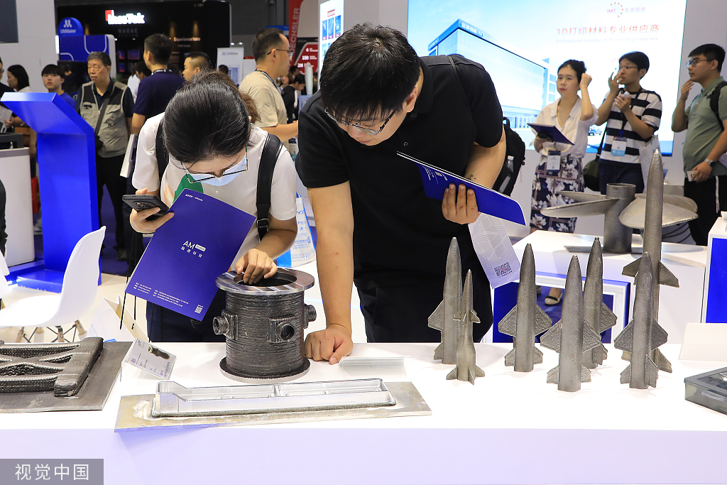 Visitors check 3D printing products at the 2023 TCT Asia in Shanghai, Sept 12, 2023. [Photo/VCG]