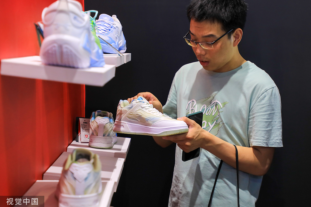 A man browses a 3D printed shoe at the 2023 TCT Asia in Shanghai, Sept 12, 2023. [Photo/VCG]