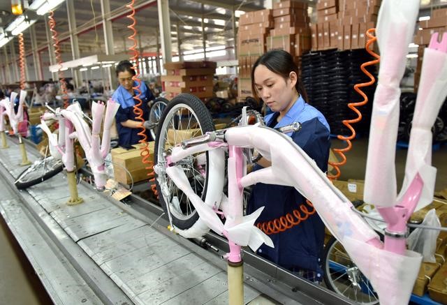 Workers assemble strollers in the production workshop of a stroller manufacturer in Weixian county, North China's Hebei province, Sept 18, 2023. [Photo/Xinhua]