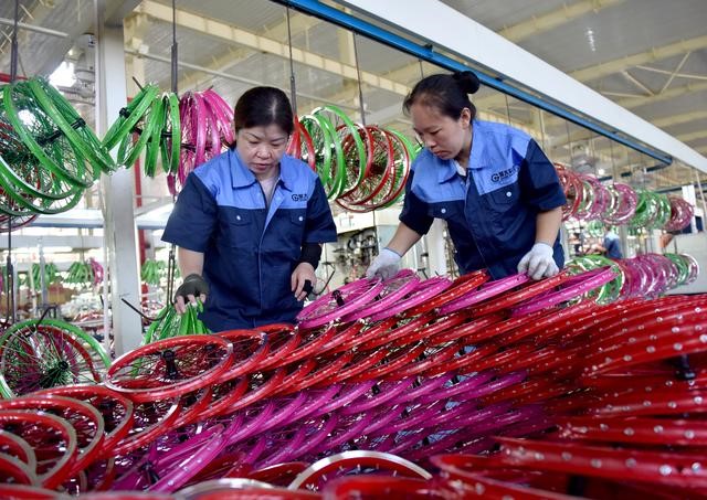 Workers of a stroller manufacturer in Weixian county, North China's Hebei province, Sept 18, 2023, tidy up stroller wheels in the production workshop. [Photo/Xinhua]