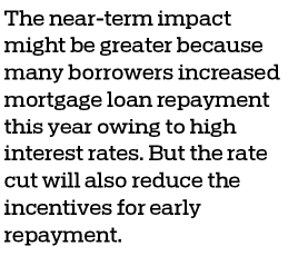 The interest rate cut on existing mortgage loans could boost consumption to a certain extent. A 100 basis point interest rate cut on the 38 trillion yuan of outstanding mortgage loans could save Chinese consumers 0.4 trillion yuan a year, equivalent to roughly 1 percent of annual retail sales. The near-term impact might be greater because many borrowers increased mortgage loan repayment this year owing to high interest rates. But the rate cut will also reduce the incentives for early repayment.