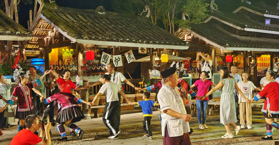 Dong people dance with visitors at a bonfire party. [Photo by Lu Zhongqiu/China Daily]