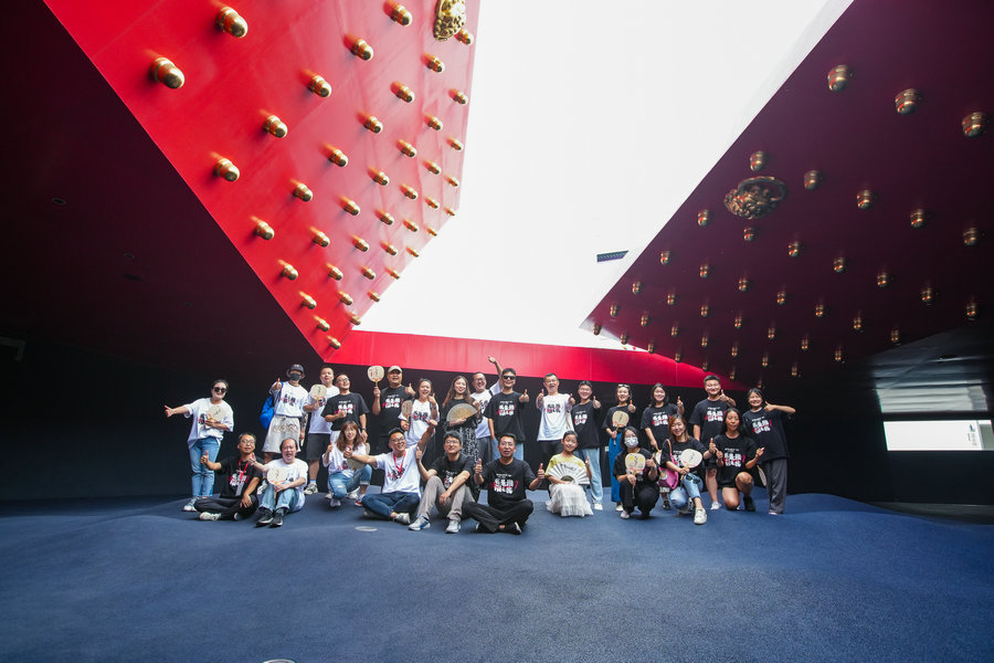Director Wang Chaoge poses with fans at the Unique Dream of Red Mansion theater complex designed by Wang. [Photo provided to China Daily]