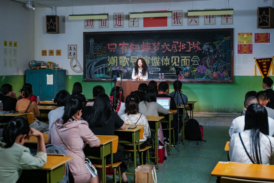 Theater director Wang Chaoge meets with fans of the Unique Dream of Red Mansion theater complex in Langfang, Hebei province, on Sunday. [Photo provided to China Daily]