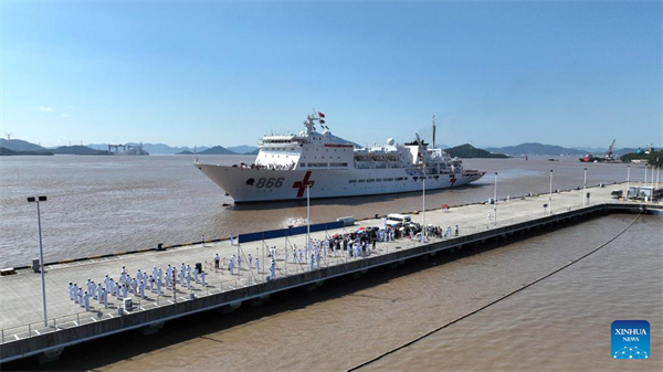 The Chinese naval hospital ship "Peace Ark" arrives at a port in Zhoushan, east China's Zhejiang Province, Sept. 19, 2023. The Chinese naval hospital ship "Peace Ark" arrived at a port in Zhoushan on Tuesday morning after completing friendly visits and humanitarian medical services to Kiribati, Tonga, Vanuatu, the Solomon Islands, and East Timor.[Photo by Gui Jiangbo/Xinhua]