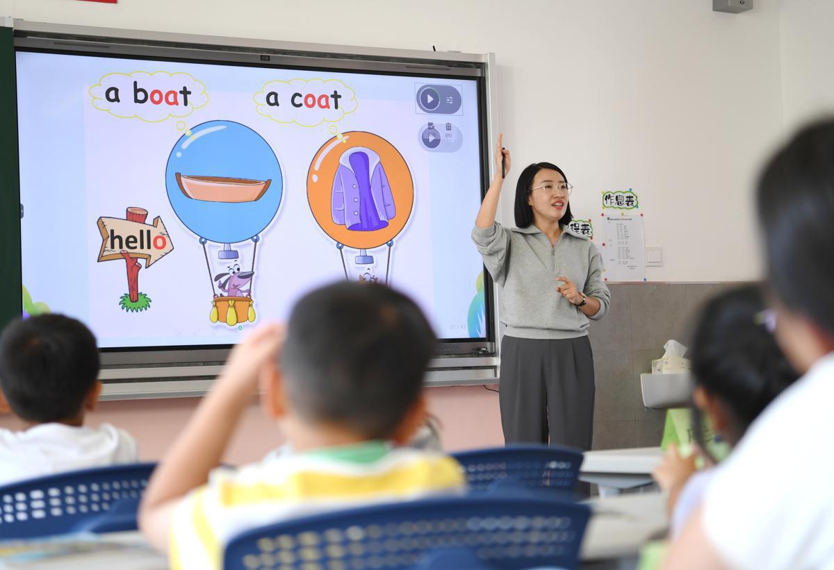 A teacher teaches English to students in Xiong'an Shijia Hutong Primary School in Xiong'an New Area, Hebei province.[Photo provided to chinadaily.com.cn]