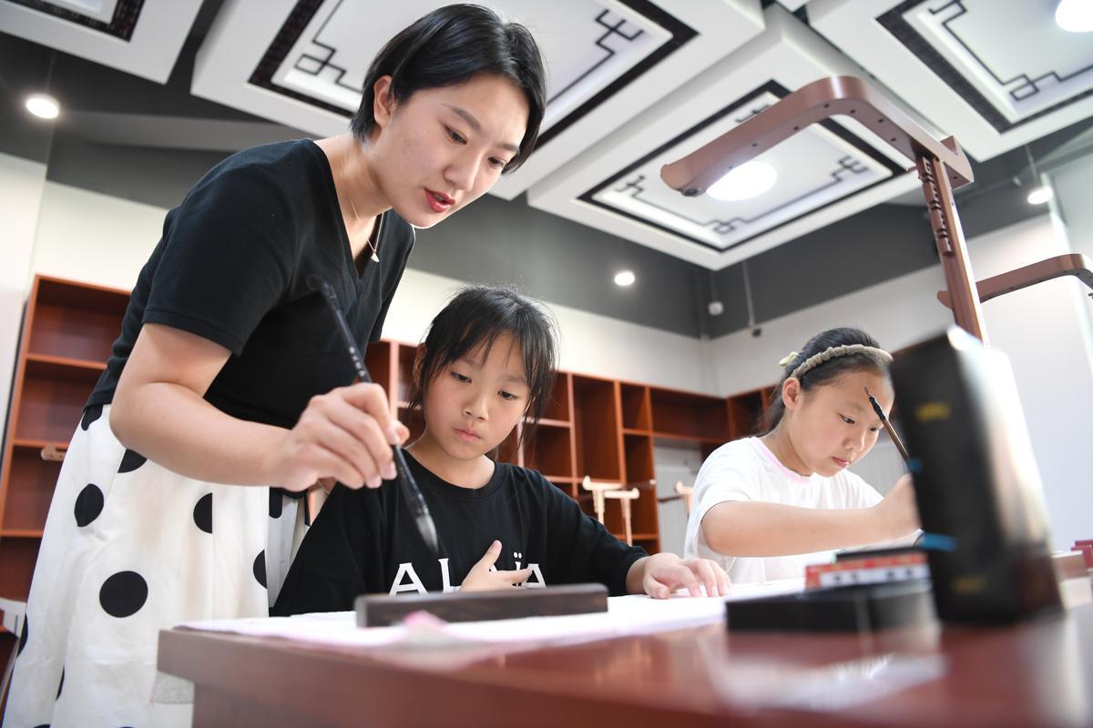 A teacher instructs students practicing calligraphy in Xiong'an Shijia Hutong Primary School in Xiong'an New Area, Hebei province.[Photo provided to chinadaily.com.cn]