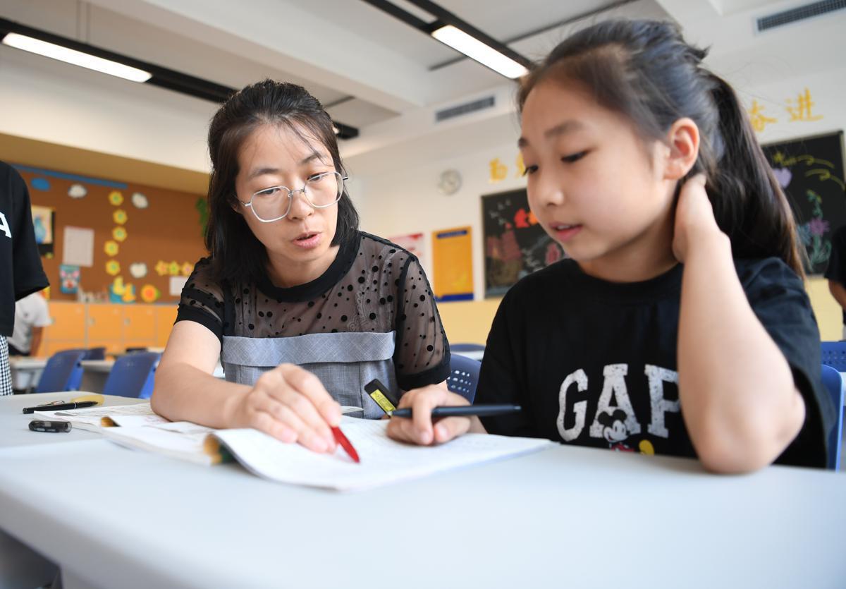 A teacher tutors a student in Xiong'an Shijia Hutong Primary School in Xiong'an New Area, Hebei province.[Photo provided to chinadaily.com.cn]