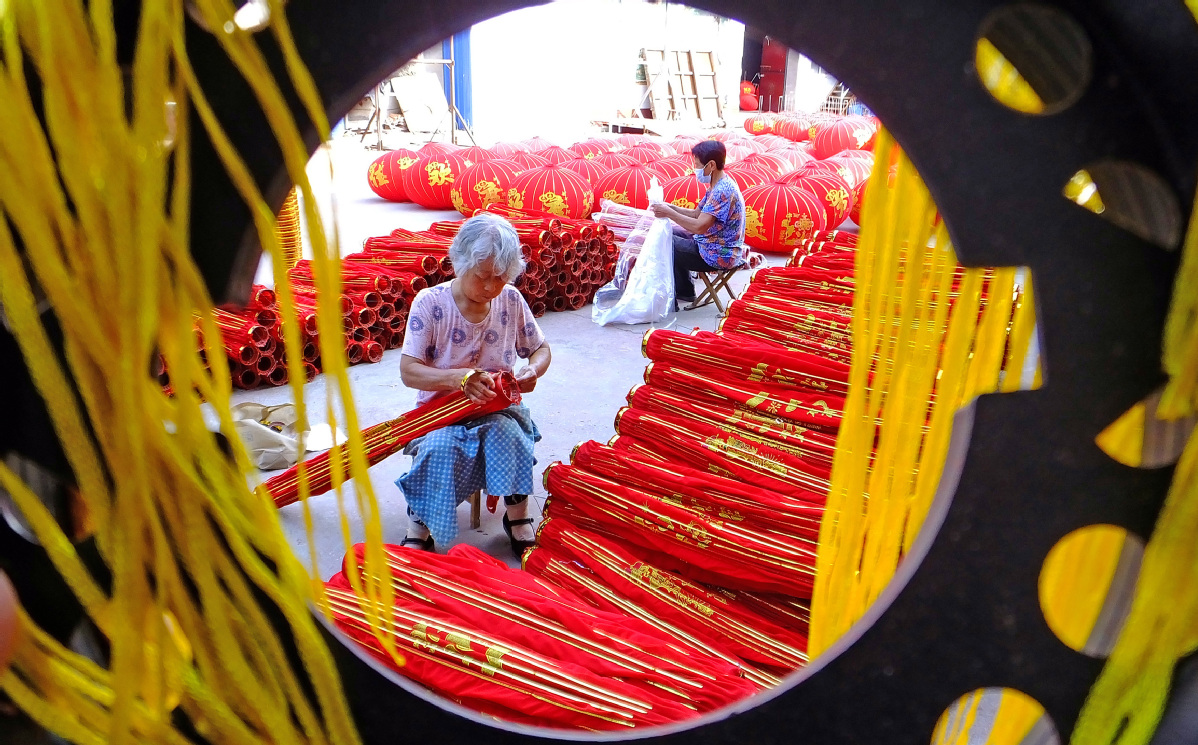 Workers in Yangzhao village of Jishan county, Shanxi province, make red lanterns ahead of the Mid-Autumn Festival and National Day holidays. [Photo by Gao Xinsheng/For chinadaily.com.cn]
