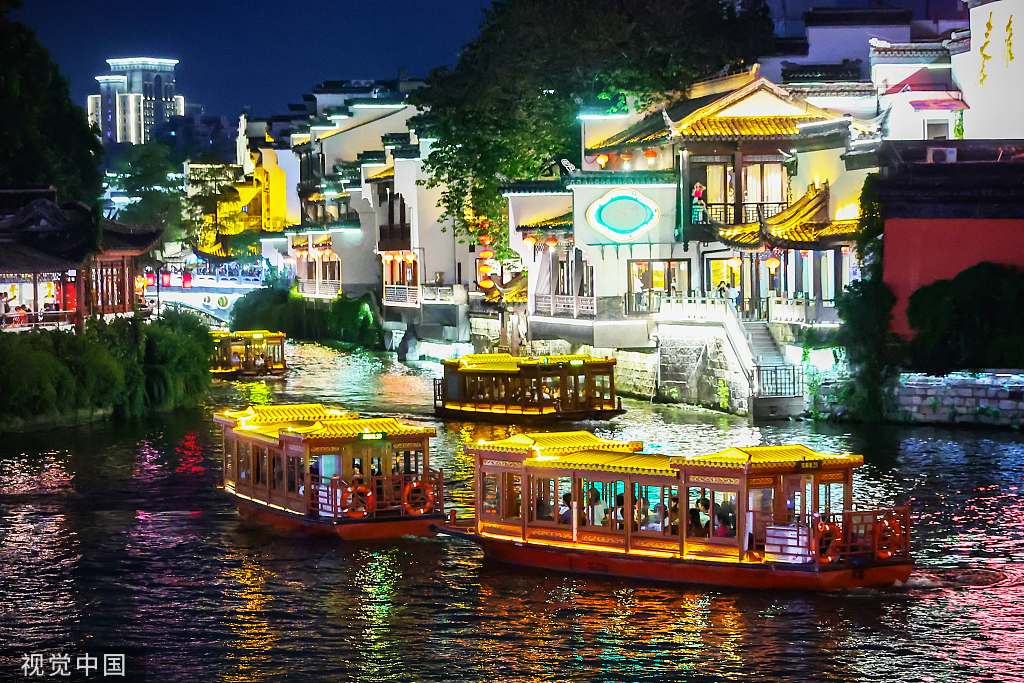 Tourists take rides on boats on the Qinhuai River in Nanjing, Jiangsu province on Aug 6, 2023. [Photo/VCG]