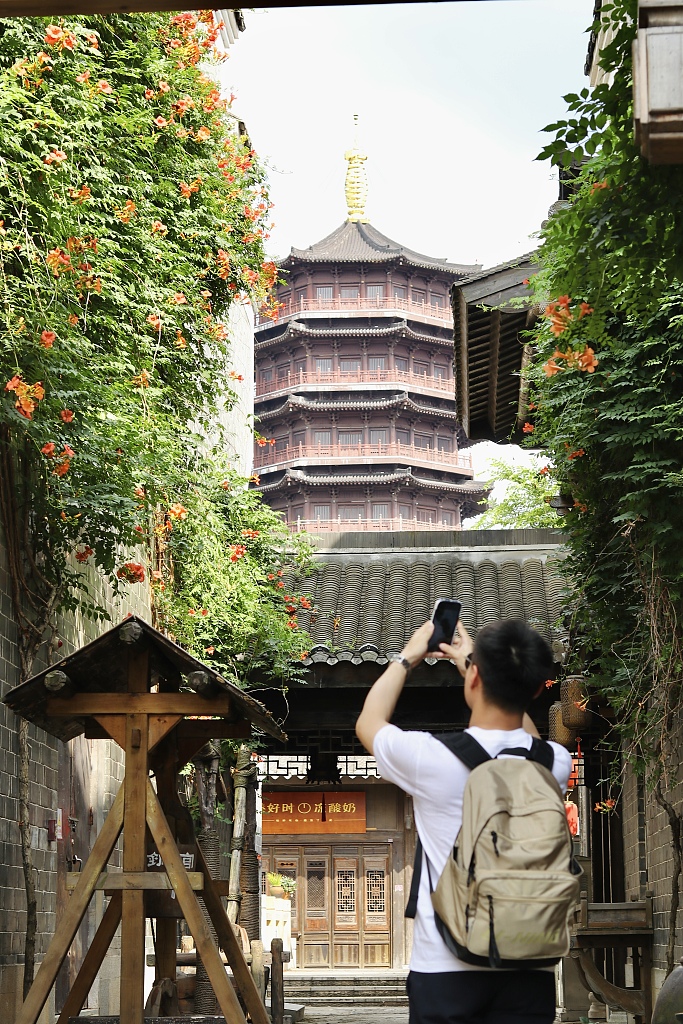 A young man takes a photo of a historic building in Changsha Tongguanyao Ancient Town, June 18, 2023. [Photo/CGTN]