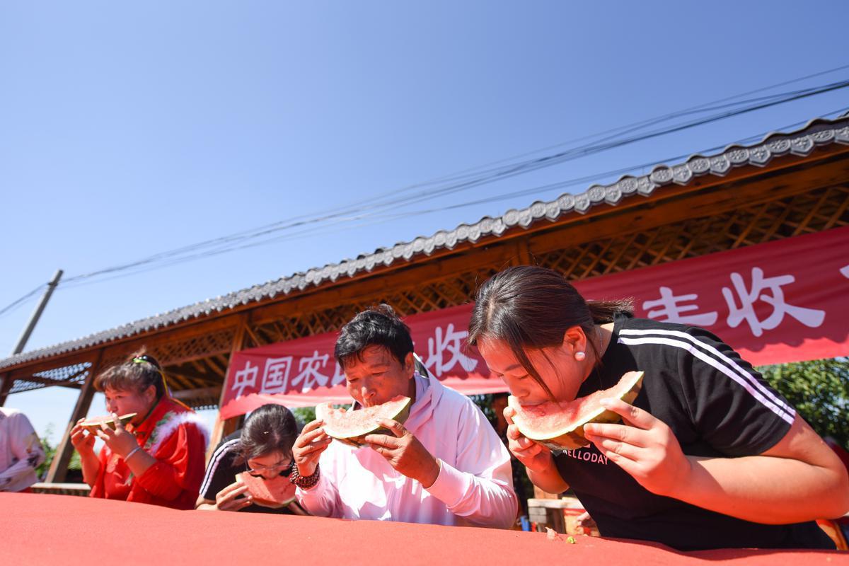 Farmers participate in a "Watermelon Eating" competition in Nanbu town of Hanshan district, Handan, North China’s Hebei province. [Photo by Li Hao/For chinadaily.com.cn]
