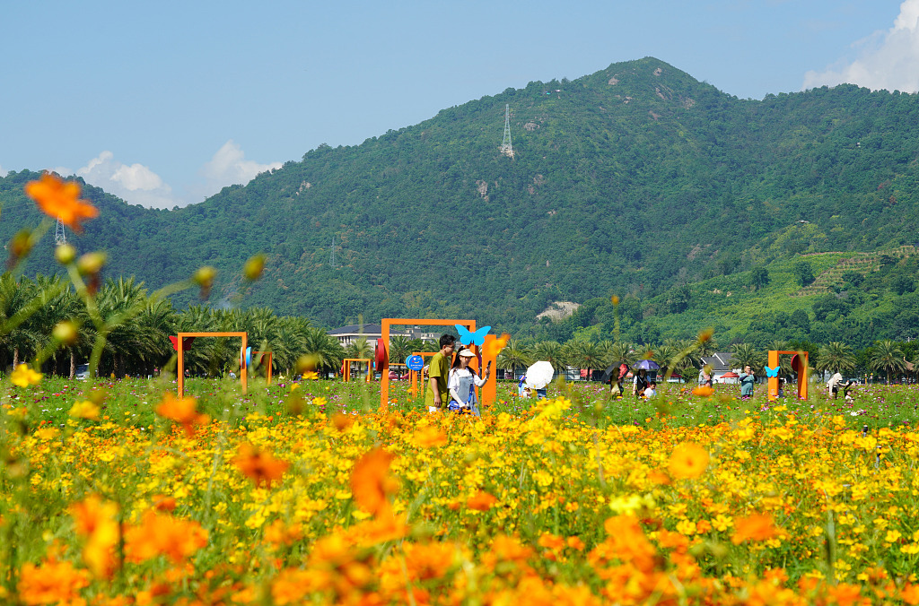 Tourists visit a flower field in Yueqing of Wenzhou, Zhejiang province, Sept 17, 2023. [Photo/VCG]