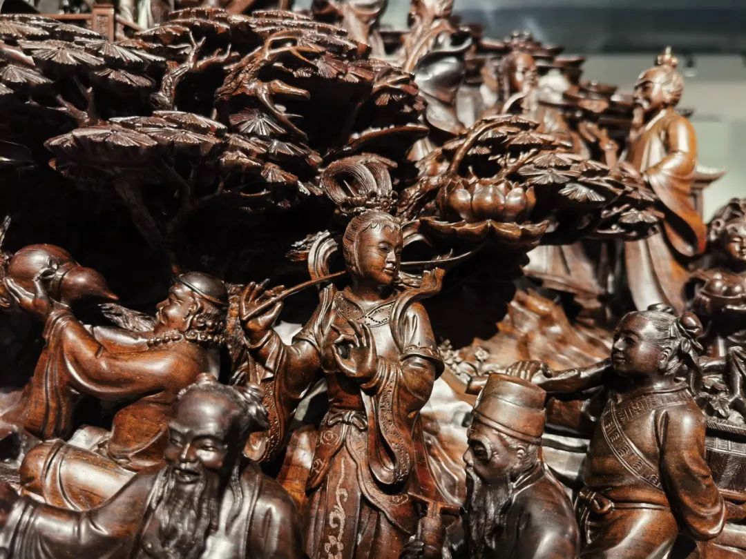 Detail of a red sandalwood ornament depicting a gathering of immortals celebrating a birthday [Photo/Official WeChat account of the Suzhou Museum]