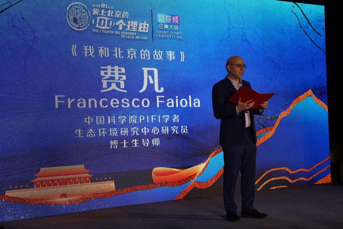 Francesco Faiola, an expert at the International Cooperation Bureau of the Chinese Academy of Sciences, gives an address at the launching ceremony of the 4th "100 Reasons to Love Beijing" short-video contest in Beijing on Sept 27, 2023. [Photo provided to chinadaily.com.cn]