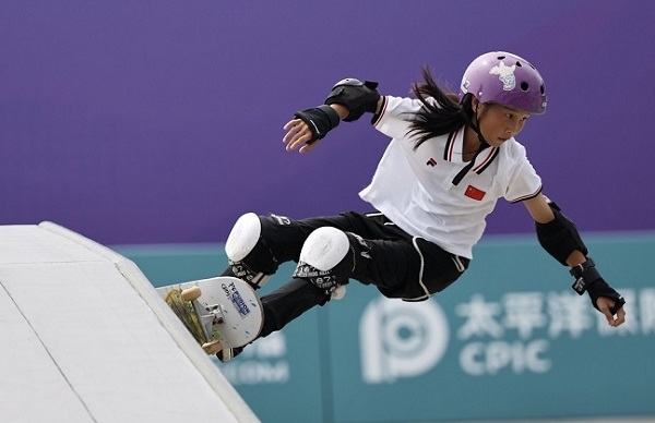 The street competition involves skaters performing daring tricks on a tough course that features rails and gaps. Cui, who hails from Jinan in East China's Shandong province, made an impressive landing off the notoriously difficult high rail - a move many of her competitors avoided.