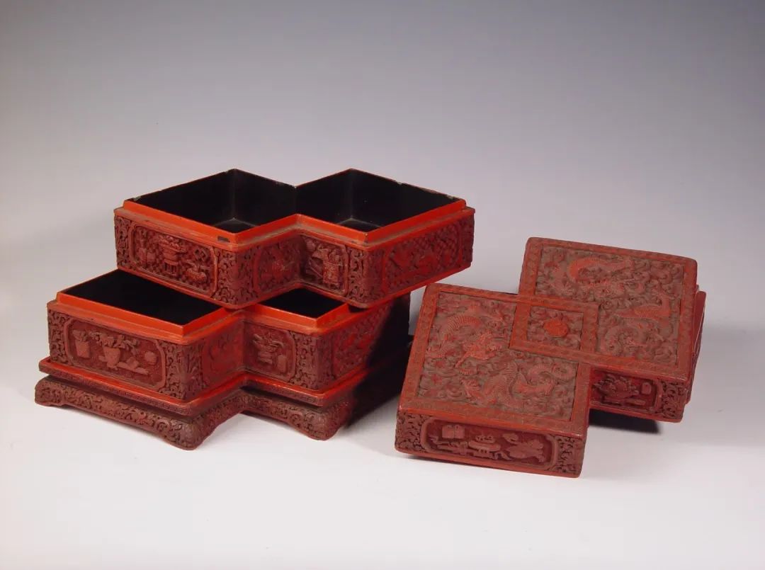 A red-lacquered box set carved with antique patterns [Photo/Official WeChat account of the Shenyang Palace Museum]