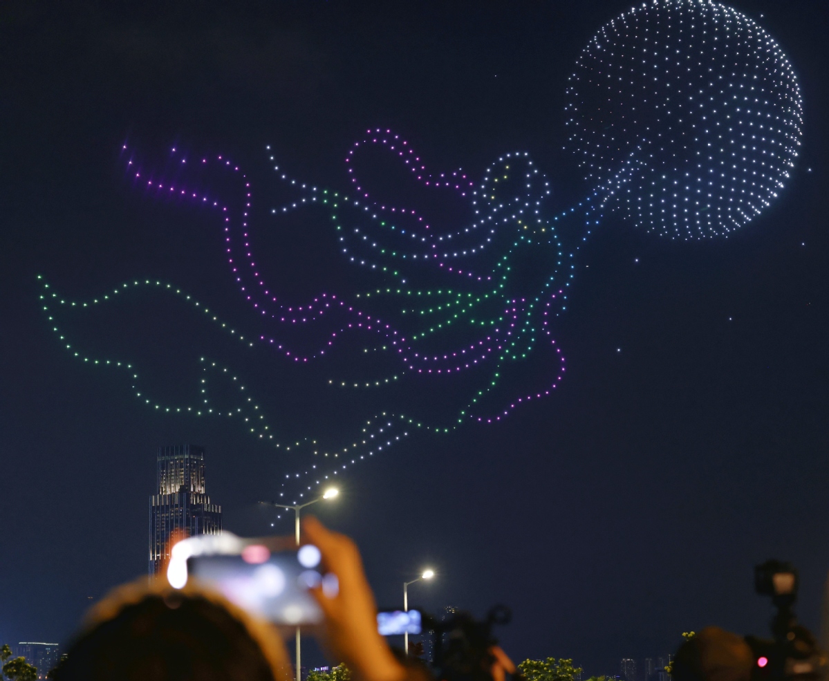 Shenzhen in Guangdong province, and Hong Kong Special Administrative Region jointly presented drone shows for the first time on Saturday when about 1,200 drones in each city lit up the night sky over Victoria Harbour in Hong Kong and OCT Harbour in Shenzhen to celebrate the Mid-Autumn Festival and National Day holidays.