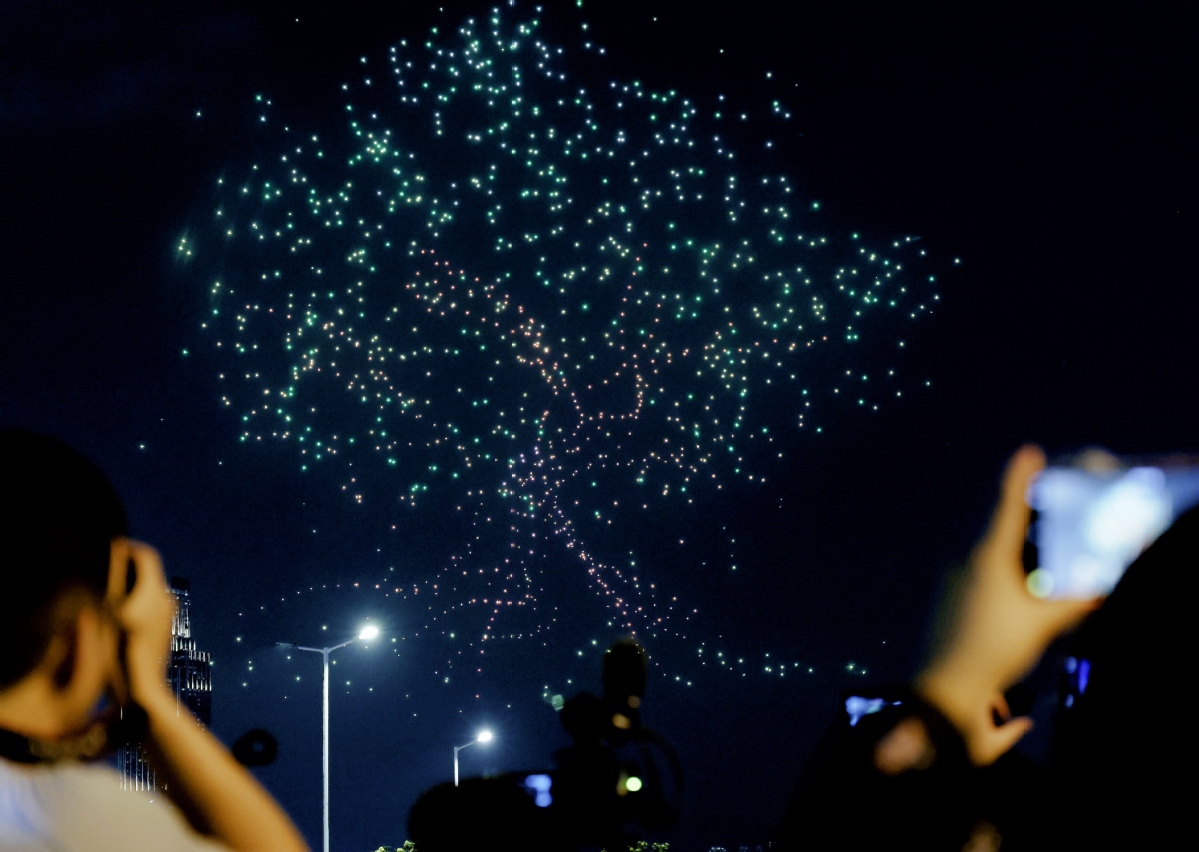 In the blink of an eye, the electric firebugs in the sky changed to the Tian'anmen Rostrum, adorned with large red lanterns, landmarks in Hong Kong and Shenzhen, and the map of China blossomed with flowers... The performance reached its climax against the backdrop of a flourishing era and world peace, wishing for a great nation, a beautiful Guangdong-Hong Kong-Macao Greater Bay Area, and the flourishing of Hong Kong. What a spectacular feast for the eyes!