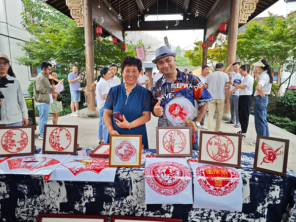 Walking into the village, the global tourists were captivated by the intricate beauty and delicate craftsmanship of local paper-cutting, as well as completed paper-cutting of the Chinese character for happiness, ducks and butterflies.