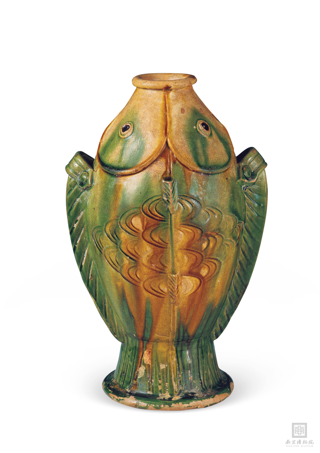 Check out this sancai vase crafted in the form of two fish facing each other! The fishes’ mouths together make up the vase’s mouth, their dorsal fins serve as the vase handles, and their tails are shaped as the vase’s base. The fishes’ eyes, scales and fins are meticulously rendered. Bright green, yellow and brown glazes intermingle and complement to adorn the vase surface.