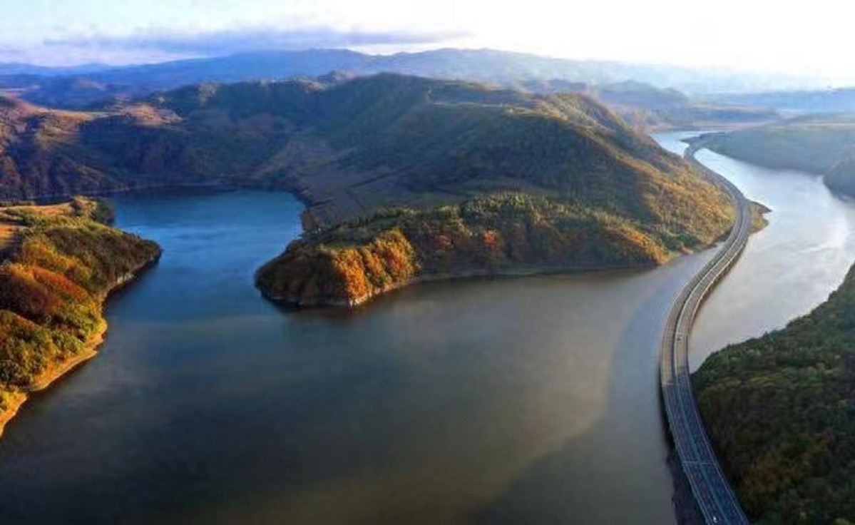 An aerial photo shows a highway in Fusong county, Jilin province, which is surrounded by undulating mountains and dense forests, which have been tinged with various colors in late autumn. [Photo by Zhao Zhiqiang/For chinadaily.com.cn]