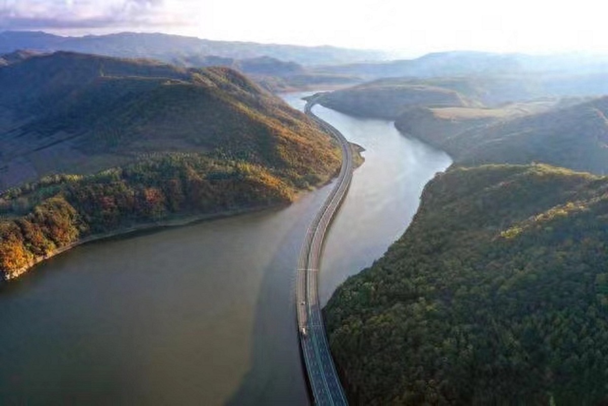 An aerial photo shows a highway in Fusong county, Jilin province, which is surrounded by undulating mountains and dense forests, which have been tinged with various colors in late autumn. [Photo by Zhao Zhiqiang/For chinadaily.com.cn]
