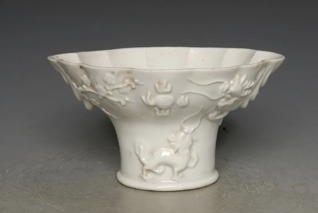 A white-glazed high-footed cup applied with molded plum flower and deer patterns, Dehua ware, Ming Dynasty [Photo/Official WeChat account of the Tianjin Museum]