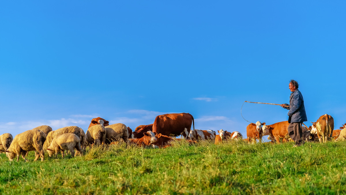 Herds of cattle and sheep leisurely eat grass in the boundless green grassland. [Photo by Li Jingcheng /Provided to chinadaily.com.cn]