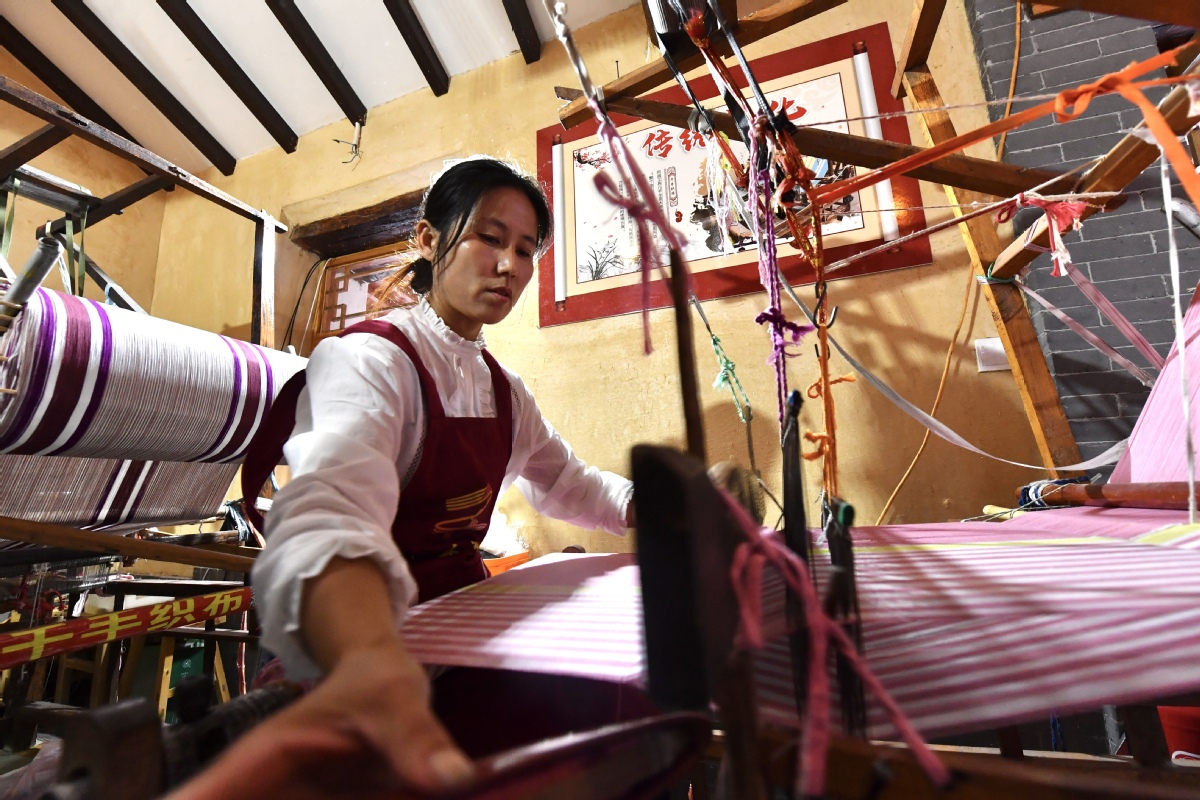 A woman demonstrates traditional handmade weaving techniques in Lijin county, Dongying, East China's Shandong province. [Photo provided to chinadaily.com.cn]