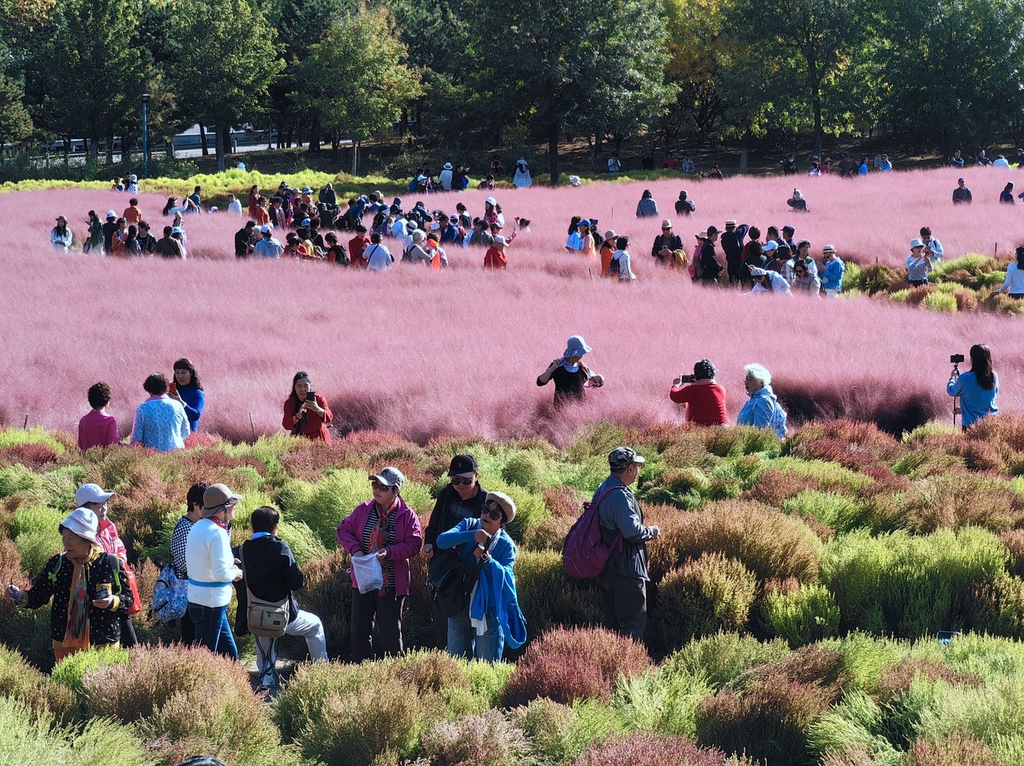 Pink muhly grass draws many visitors to Beijing Olympic Forest Park. [Photo/IC]